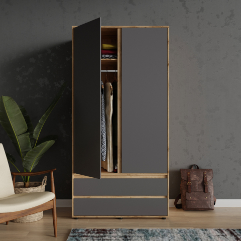 шкаф содержит два выдвижных ящика и одно закрытое отделение со штангой для вешалок внутри |