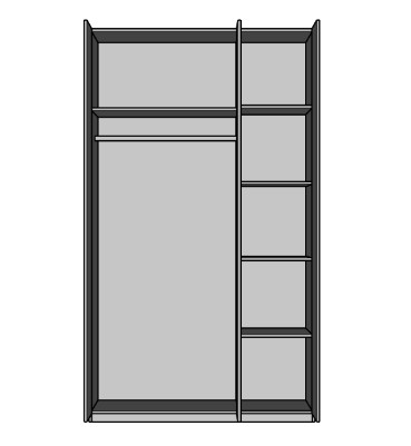 шкаф содержит два отделения: одинарное отделение с рядом удобных вместительных полок и двойное отделение со штангой для вешалок и отделения |