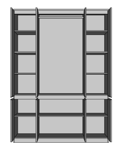 шкаф зонирован на две секции – верхнюю и нижнюю: верхняя секция включает два отделения с полками и двойное отделение со штангой для вешалок, нижняя секция оснащена вместительными полками |