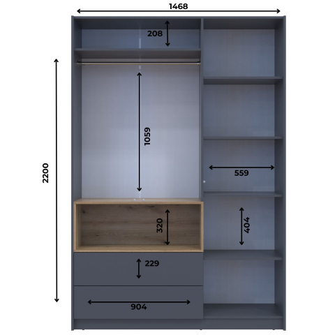 шкаф содержит четыре отделения: отделение с закрытыми полками, отделение со штангой для вешалок, отделение с выдвижными ящиками и отрытую нишу |