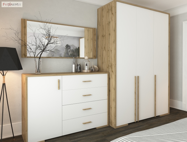 Трехдверный шкаф Франческа Сокме настоящая находка для гардеробной комнаты или больших спален. Высокий и вместительный шкаф прекрасно подходит для хранения ваших вещей и имеет два одинаковых платяных отделения со штангой для вешалок и полочкой. Шкаф с легкостью обеспечит сохранность и порядок Вашего гардероба. Шкаф может дополнительно комплектоваться полками, для наиболее комфортной эксплуатации изделия. Корпус и фасады изготавливаются из качественного ДСП толщиной 16 мм и 22 мм в интересном сочетании цветов: корпус выполнен в цвете «дуб вотан» максимально приближенном к текстуре натуральной древесины, фасады белого цвета подчеркивают текстуру древесины корпуса и придают спальне современного характера. Торцевые поверхности всех внутренних и наружных элементов изделий облицованы кромкой ABS толщиной 0,5/1 мм, придавая мебели завершенный красивый и ухоженный вид. Коллекция привлекает внимание лаконичным и сдержанным дизайном; минималистическим стилем; сочетанием белого с ярко выраженной древесной текстурой; продолговатыми ручками из ДСП, в цвет корпуса; оригинальными ножками в виде подставки, которые обеспечивают устойчивость и надежность конструкции; фирменными комплектующими: петлями без доводчика Hafele, которые обеспечивают максимальный комфорт в использовании. Спокойный оттенок спальни Франческа Сокме подчеркнет Ваше собственное совершенство стиля и неповторимости и создаст уютную зону отдыха.