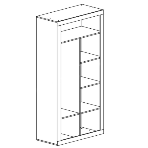 шкаф разделен на две секции с общей верхней полкой, слева расположена штанга для вешалок и полка, справа - три полки |