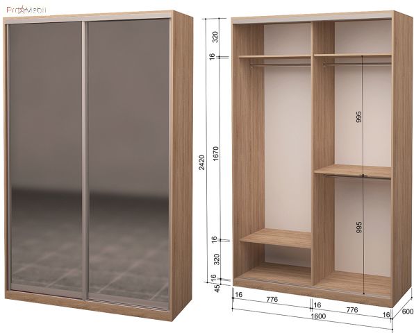 Шкаф-купе Roko - это надежная модель среди шкафов, которая гармонично впишется в Ваш интерьер и создают уют благодаря большой гамме цветов, разных размеров и прочных материалов. Шкаф-купе состоит из двух раздвижных зеркальных дверей. Внутри справа есть две штанги для вешалок и полка над штангой и внизу еще одна полка, с левой стороны одна штанга для вешалок и две полки благодаря чему Вы можете разместить все необходимые вещи. Шкаф-купе Roko представлен в широком диапазоне оттенков: дуб венге, дуб сонома, дуб молочный, что позволят мебели легко вписаться в различные дизайны, наполнив квартиру шармом и вдохновением.