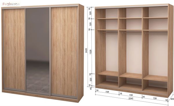 Шкаф-купе Roko - выбор качества от украинской фабрики среди шкафов, которая гармонично впишется в Ваш интерьер и создают уют благодаря большой гамме цветов, разных размеров и прочных материалов. Шкаф-купе состоит из трёх раздвижных дверей: две из ДСП, одна зеркальная. Внутренние наполнение шкафа состоит из равных трёх отделений, в котором по одной штанги для вешалок одежи и по три полки благодаря чему Вы можете разместить все необходимые вещи. Шкаф-купе Roko представлен в широком диапазоне оттенков: дуб венге, дуб сонома, дуб молочный, нимфея альба, серый графит, что позволят мебели легко вписаться в различные дизайны, наполнив квартиру шармом и вдохновением.