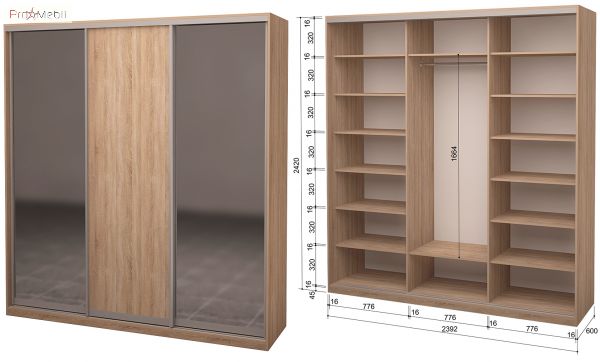 Шкаф-купе Roko - выбор качества от украинской фабрики среди шкафов, которая гармонично впишется в Ваш интерьер и создают уют благодаря большой гамме цветов, разных размеров и прочных материалов. Шкаф-купе состоит из трёх раздвижных дверей: одна из ДСП, две зеркальные. Внутри справа и слева - по шесть полок, а по центру одна штанга для вешалок и две полки благодаря чему Вы можете разместить все необходимые вещи. Шкаф-купе Roko представлен в широком диапазоне оттенков: дуб венге, дуб сонома, дуб молочный, нимфея альба, серый графит, что позволят мебели легко вписаться в различные дизайны, наполнив квартиру шармом и вдохновением.