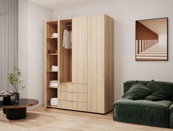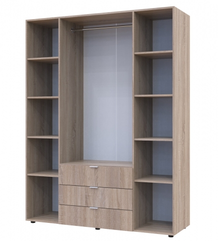 шкаф содержит четыре отделения: отделение с тремя выдвижными ящиками, два отделения с полками и одно отделение со штангой для вешалок |