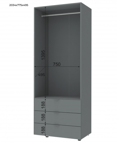 шкаф содержит два отделения: отделение с тремя выдвижными ящиками и отделение со штангой для вешалок |