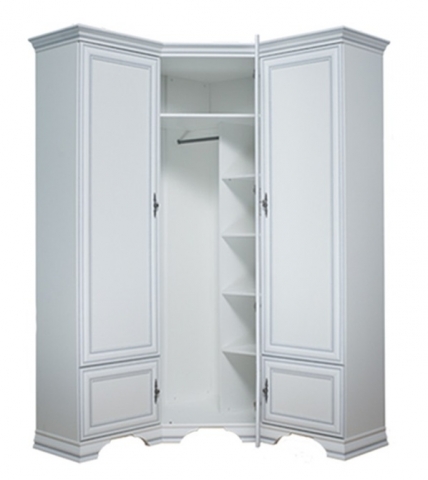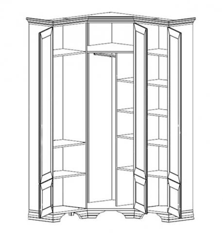 Шкаф угловой SZFN5D Кентуки ВМК (БРВ) выполненный в лучших традициях классики, с первого взгляда покоряет своей грациозностью и изяществом и прекрасно дополнит интерьер гостиной, спальни, детской комнаты, рабочего кабинета и прихожей. Шкаф содержит пять закрытых отделений: в центральной части расположены пять полок и штанга для вешалок, за левой верхней дверью установлены две полки и выдвижной тремпель для одежды, за правой верхней дверью – четыре полки. Характерными особенностями коллекции является изящный дизайн; патина, нанесенная на фасады, делает мебель объемней и создает эффект старины; витиеватые металлические ручки бронзового цвета; декоративные планки; резные карнизы и ножки являются бесспорным украшением коллекции; а фирменные комплектующие: петли и шариковые направляющие полного выдвижения, гарантируют надежность и долговечность изделиям. Коллекция Кентуки ВМК (БРВ) располагает к себе, излучая особую легкость, очарование, естественность и изящность и отлично подойдет любителям уютных и теплых комнат.