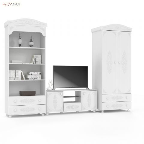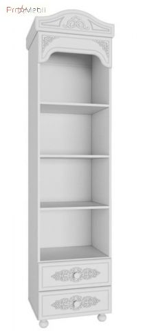 Вместительный открытый стеллаж АС-43 Белль Санти прекрасно дополнит интерьер гостиной, спальни, детской комнаты. Стеллаж АС-43 Белль Santi содержит два выдвижных ящика и четыре открытых отделения. Корпус изготавливается из ламинированной ДСП толщиной 16 мм немецкого концерна «Kronospan», фасад – из МДФ с технологией нанесения объемного рисунка 3D. Торцы деталей оклеиваются ПВХ-кромкой фирмы Rehau. Мебель Белль Санти выпускается в нежном цвете «белое дерево» со структурой дерева. Характерными особенностями мебели Белль Santi является изящный дизайн, объемные ажурные узоры на фасадах, декоративные карнизы интегрированные в корпус, фигурные ручки и ножки из натурального дерева, фирменные петли немецкого концерна Hettich и телескопические направляющие полного выдвижения. Мебель Белль Santi это способ уникальной аранжировки интерьера с уникальным, сказочно красивым дизайном.