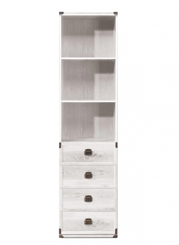 Современный и стильный стеллаж JREG4SO/50 Индиана ВМК (БРВ) для обустройства гостиной, детской, столовой и рабочего кабинета. Стеллаж содержит четыре выдвижных ящика и три открытых отделения. Коллекция выполнена в стиле дикого запада, вдохновленная приключенческими мотивами, привлекает тех, кто остается в душе мечтателем о дальних странах и подчеркнута простыми, немного грубоватыми формами, оригинальными металлическими ручками в виде скоб и декоративными металлическими закругленными накладками на верхних и нижних частях корпуса, тускло отблескивающие медью, насыщенным цветом «сосна аризонская», завершающий гармоничный образ. Мебель Индиана ВМК (БРВ) позволит разнообразить надоевший интерьер, создав необычный, неординарный стиль.