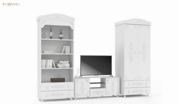 Гарнитур в гостиную Белль Санти - изысканный набор мебели от украинского производителя «Санти-Мебель», для обустройства гостиной комнаты. Корпус изготавливается из ламинированной ДСП толщиной 16 мм немецкого концерна «Kronospan», фасад – из МДФ с технологией нанесения объемного рисунка 3D. Торцы деталей оклеиваются ПВХ-кромкой фирмы Rehau. Мебель Белль Санти выпускается в нежном цвете «белое дерево» со структурой дерева. Характерными особенностями мебели Белль Santi является изящный дизайн, объемные ажурные узоры на фасадах, декоративные карнизы интегрированные в корпус, фигурные ручки и ножки из натурального дерева, фирменные петли немецкого концерна Hettich и телескопические направляющие полного выдвижения. Гарнитур Белль Санти представляет собой модульный набор элементов для создания изысканного и, одновременно, простого интерьера гостиной. Гостиную украсят оригинальная ТВ - тумба, вместительный шкаф и стеллаж. Мебель Белль Santi это способ уникальной аранжировки интерьера с уникальным, сказочно красивым дизайном. Купить мебель Белль Санти можно в нашем интернет-магазине ProMebli.ua с доставкой по всей Украине. Оплата за наличный и безналичный расчет, в кредит или рассрочку.