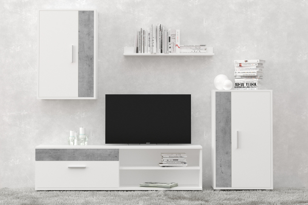 Стенка Барато Мини Гербор – стильная, практичная коллекция от украинской мебельной фабрики Gerbor - холдинг, для обустройства интерьера гостиной в соответствии с вашими предпочтениями. Корпус и фасады изготавливаются из качественного ламинированного ДСП, в сочетании цветов «нимфея альба» с «бетон». Мебель Барато Мини Gerbor характеризуется стильным дизайном, простыми строгими формами и четкими линиями, продолговатыми удобными ручками.