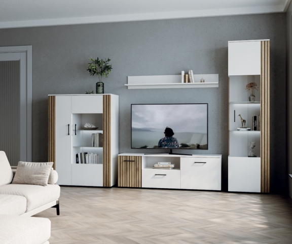 Стенка Либерти ВМК - Украина (БРВ) - роскошный и функциональный набор мебели от украинской мебельной фабрики ВМК - Украина, для обустройства интерьера гостиной в соответствии с вашими предпочтениями. Корпус и фасады изготавливаются из качественного ламинированного ДСП, в сочетании белого альпийского корпуса с текстурным рельефными реечными фасадами в цвете таблила. Мебель характеризуется стильным минималистичным дизайном, простыми строгими формами и продолговатыми удобными ручками, современной светодиодной подсветкой.