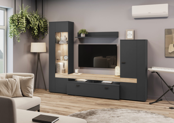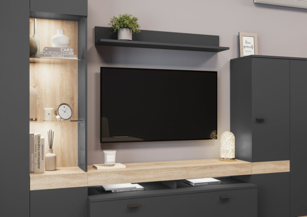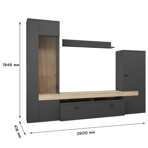Стенка Соренто антрацит Сокме - современный стильный ансамбль мебели от украинской фабрики Сокме, созданный для обустройства уютного и выразительного интерьера гостиной. Корпус и фасадные части изготавливаются из качественного ламинированного ДСП толщиной 16 мм и 18 мм, в эффектном сочетании глубокого матового антрацита с акцентными вставками под древесину дуб сонома, что придает пространству тепло и благородный акцент. Торцевые поверхности всех внутренних и внешних элементов аккуратно облицованы кромкой ПВХ толщиной 0,6/2 мм и ABS толщиной 0,5 мм, что придает мебели завершенный и ухоженный вид. Стенка привлекает внимание: минималистичным дизайном; четкими прямыми линиями; контрастом антрацитовых поверхностей и древесной текстуры; изящными ручками, подчеркивающими аккуратность форм; дополнительным освещением; прочными устойчивыми ножками; фирменной фурнитурой: петлями Hafele, которые обеспечивают удобство и долговечность в использовании. Гарнитур состоит из функциональной витрины, которая дополнительно может комплектоваться LED-подсветкой полок, тумбы под телевизор, вместительного пенала и навесной полки. Мебель Соренто Сокме подарит гостиной изысканный характер, создавая атмосферу уюта и индивидуальности. Купить мебель Соренто антрацит Сокме можно в нашем интернет-магазине ProMebli.ua с доставкой по всей Украине. Оплата наличными и безналичным расчетом, в кредит и рассрочку.
