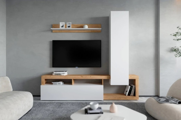 - тумба под телевизор с откидными дверцами: за дверцей удобно разместить технику и аксессуары, а открытые полки отлично подходят для книг или декоративных предметов;
