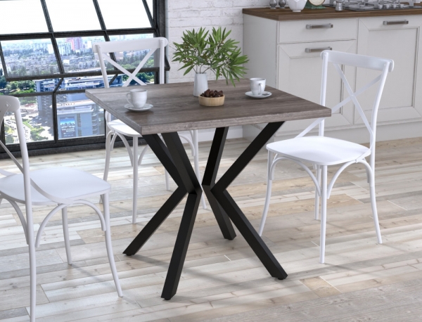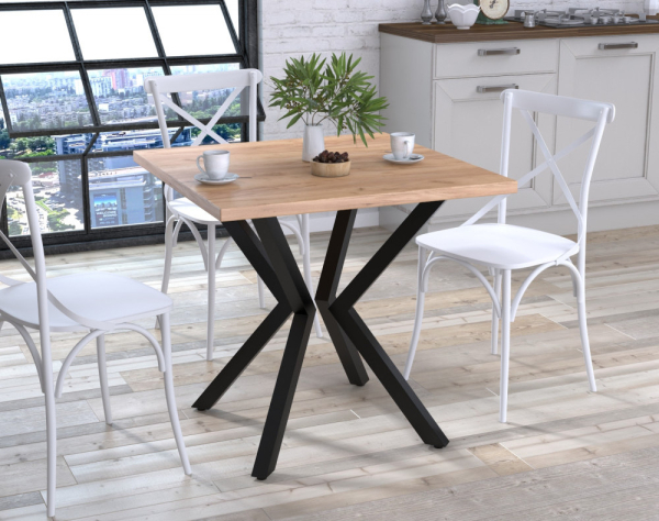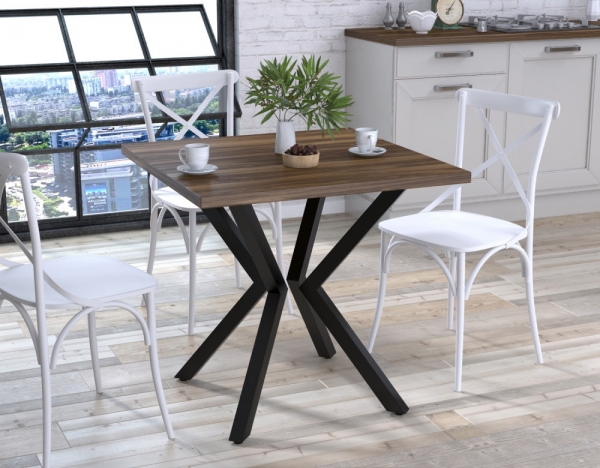 Квадратный обеденный стол Кубра от компании Loft Design - воплощение элегантности и стиля в вашем интерьере. Его уникальный дизайн включает небольшую столешницу, которая прекрасно сочетается с декоративными металлическими ножками, придавая столу уникальный характер и особую привлекательность. С легкостью вместит до 4 человек, идеально подходит для кухонного пространства дома, обеденных зон в офисе или кафе. Ножки изготовлены из трубы с профилем 40х40 мм. Они выполнены в необычном дизайне и почти соприкасаются друг с другом посередине. Вверху ножек приварены металлические пластины с отверстиями, для крепления к столешнице. Ножки оснащены шарнирами, благодаря чему стол можно выставить на неровном полу. Стол Кубра состоит из четырёх отдельных ножек и столешницы из ламинированного ДСП. Размер столешницы составляют 80х80 см. Толщина столешницы - 36 мм. Обратите внимание, что данный стол надо защищать от длительного воздействия жидкости или высоких температур. Рекомендуем использовать подставки или подложки под предметы. Внимание: Стулья не входят в комплект со столом!