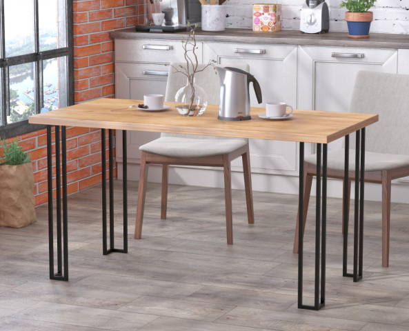 Обеденный стол Сквер 138-70 от компании Loft Design выполнен в стиле Лофт: металлические ножки сочетаются с массивной столешницей с красивой текстурой имитирующей дорогие породы дерева. Этот стол подойдет для любой современной кухни. Несмотря на свои внушительные размеры и крупные детали, стол смотрится элегантно и стильно. Металлические ножки изготовлены из трубы профилем 15*15 мм. Вверху ножек приварена широкая пластина толщиной 3 мм для обеспечения устойчивости конструкции. Ножки окрашены с помощью порошковой покраски, которая устойчива к внешним воздействиям. Стол комплектуется войлочными накладками для предотвращения повреждения поверхности пола. Благодаря своей конструкции ножки выглядят легко и прозрачно и в то же время являются надёжной опорой стола. Столешница изготовлена из сдвоенного ламинированного ДСП. Толщина столешницы - 36 мм. По периметру наклеена кромка из ПВХ толщиной 2 мм со скругленными краями. Размер столешницы 138*70 см. Обратите внимание, что данный стол надо защищать длительного воздействия жидкости или высоких температур. Рекомендуем использовать подставки или подложки под предметы.