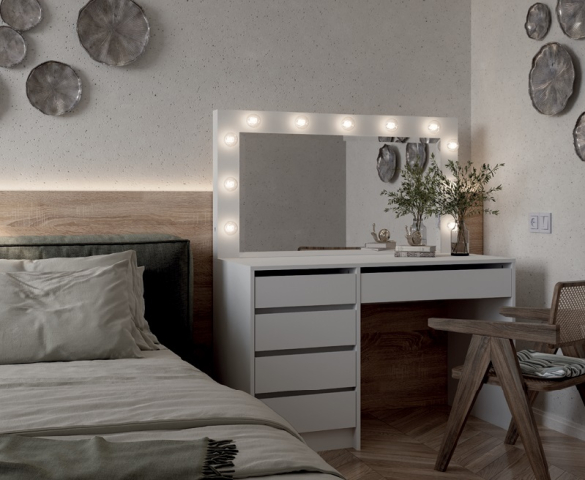 Элегантный туалетный столик BIU5S-МДФ ВМК (БРВ) в классическом стиле – незаменимый элемент мебели для женской комнаты и идеальное место для ежедневного ухода за собой. Столик оснащен пятью выдвижными ящиками, которые прекрасно подойдут для хранения парфюма, косметики, мелких аксессуаров и прочих необходимых предметов. Корпус и фасады выполнены из качественного ламинированного МДФ в благородном белоснежном цвете "нимфея альба" с глянцевым покрытием, что придает мебели утонченность и свежесть. Дизайн привлекает внимание классическим решением с изящной фрезеровкой на верхней части фасадов, которая заменяет традиционные ручки, сохраняя чистоту линий. Столик обладает прочной конструкцией с устойчивой основой, что гарантирует долговечность и комфорт в использовании. Фирменные комплектующие обеспечивают безупречную функциональность и надёжность. Изысканный туалетный столик станет не только практичным помощником, но и стильным украшением интерьера, создающим атмосферу уюта и гармонии.