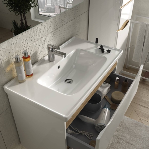Тумба для ванной с умывальником 80 Idea Liga Sanwerk прекрасно дополнит интерьер ванной комнаты и поможет рационально использовать пространство под раковиной и улучшает эстетичный вид в целом. Тумба комплектуется керамическим умывальником «Idea 2.0», производитель «Kale Seramik», Турция с бортиками по периметру, толщина умывальника - 45 мм, глубина - 135 мм. Стильная тумба имеет два выдвижных ящика, что позволяет хранить различную бытовую химию и хозяйственные мелочи. Корпус и фасады изготовлены из высококачественного МДФ толщиной 16 мм и окрашены краской итальянского производства Sayerlack "белого" цвета с контрастными вставки светлого дерева Renolit в цвете "мессина". Характерными особенностями мебели является сочетание прямых фасадов с закруглениями на них, вместо традиционных ручек для открывания используются выемки в фасаде, декорированные с внутренней стороны контрастной планкой, практичный серый цвет внутри ящиков, устойчивые ножки, фурнитура высокого качества Blum (Австрия), что обеспечивает плавное, мягкое закрытие и долгую, надежную работу всех подвижных частей. Мебель Liga Sanwerk создаст неповторимый образ и эксклюзивный дизайн вашей ванной комнаты.