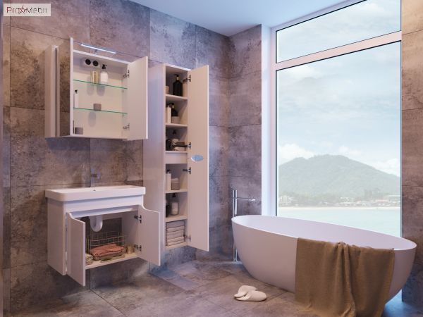 Тумба для ванной с умывальником Lvr-70 Livorno Ювента прекрасно дополнит интерьер ванной комнаты и поможет рационально использовать пространство под раковиной и улучшает эстетичный вид в целом. Тумба комплектуется керамическим умывальником «Luxury-70», производитель«Sanovit», Турция и имеет одно закрытое отделение с двумя распашными дверцами, внутреннее пространство за которыми позволяет хранить различную бытовую химию и хозяйственные мелочи. В конструкции предусмотрен подвод и отвод воды. Тумба может быть как подвесной, так и напольной. Для подвешивания вмонтировано два регулируемых навеса. Для напольной установки дополнительно комплектуется двумя или четырьмя ножками высотой 200 мм, по вашему пожеланию (ножки в стоимость комплекта не включены). Корпус и фасадные части изготовлены из МДФ одностороннего ламинирования толщиной 16 мм. Внешне поверхность мебели покрыта высокоглянцевой ПВХ-пленкой. Мебель для ванной Livorno Juventa выполнена в классическом цвете белый глянец, который идеально впишется в любой дизайн. Главной особенностью серии являются лаконичный дизайн, динамичные линии, плавные формы; отсутствие ручек, их роль выполняют фрезерованные на фасаде выемки; ящики и двери с системой «Soft close», которые обеспечивают плавное и мягкое закрывание. Тщательно продуманные модули с небольшой глубиной и шириной отлично подойдут даже для самых компактных ванных комнат. Коллекция Livorno Ювента – это лучшее решение для ванной комнаты, благодаря своим параметрам сочетается с самыми различными интерьерами и стилями.
