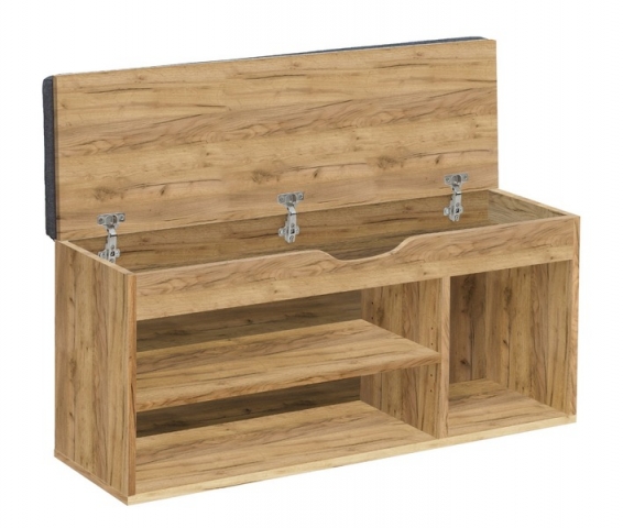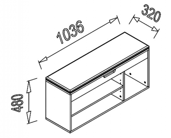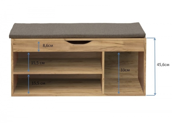 тумба в форме лавочки с мягким сидением имеет одно закрытое отделение и отрытые полочки |