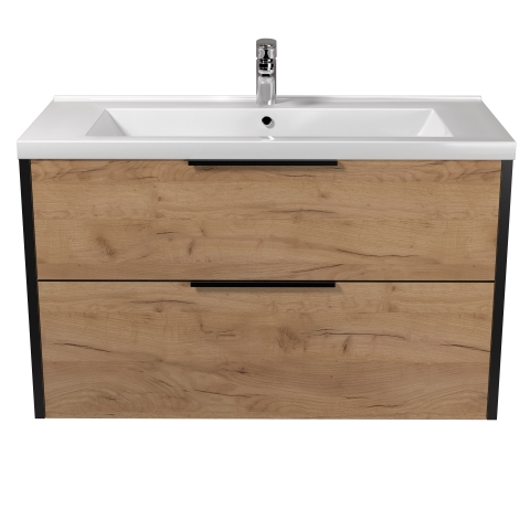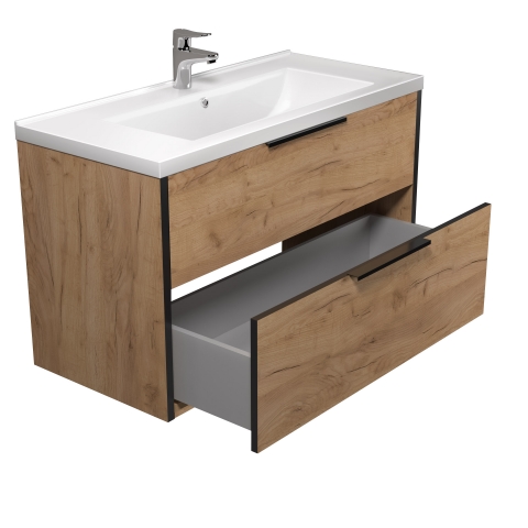 Стильная и современная тумба для ванной с умывальником 100-A Line Craft Мойдодыр прекрасно дополнит интерьер ванной комнаты и поможет рационально использовать пространство под раковиной и улучшает эстетичный вид в целом. Тумба комплектуется умывальником из искусственного камня «Cosmopolitan-100», производитель «TM Amidicon», Украина и имеет два выдвижных ящика, что позволит удобно разложить всевозможные гели, крема, полотенца и прочие принадлежности, спрятать бытовую химию, которая не должна быть на виду. Характерными особенностями тумбы Лайн Крафт Мойдодыр являются оригинальный и современный дизайн; простота и изысканность линий; комбинация цветов: натуральный древесный оттенок и контрастный черный контур; удобные миниатюрные ручки, контрастного черного цвета; подвесной монтаж; фирменные комплектующие направляющие с доводчиками, производства «Hettich», которые обеспечивают плавное и мягкое закрывание. Мебель Line Craft Мойдодыр наполнит ванную теплом и уютом, создавая положительное настроение на целый день.