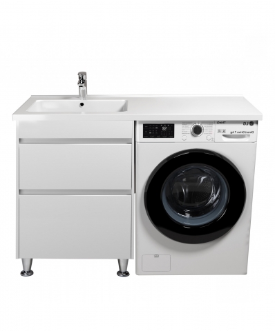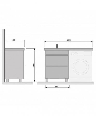 тумба имеет два выдвижных ящика и место для стиральной машины |