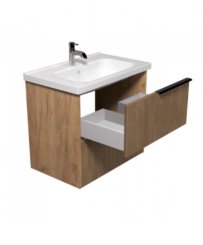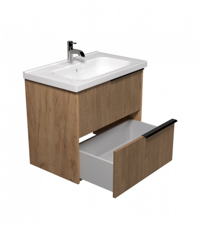 Тумба для ванной с умывальником 70-A Grace Мойдодыр - это настоящее воплощение великолепия и таинственности, где каждый элемент словно хранит в себе тайну и уникальную историю написанную природой, особенную глубину и многогранность, придающие интерьеру ванной комнаты особую атмосферу уюта и загадочности. Тумба комплектуется керамическим умывальником «Ideal-70», производитель «Creavit», Турция и имеет два выдвижных ящика, что позволит удобно разложить всевозможные гели, крема, полотенца и другие вещи, спрятать бытовую химию, скрывая их от окружающих. Характерными особенностями мебели являются изысканный и роскошный вид; искусно обработанные фасады с рифлением, которые особым образом подчеркивают элегантный внешний вид; черные ручки, словно акценты в симфонии дизайна, добавляют изысканности и современного шарма; подвесной монтаж - подарит ощущение легкости и воздушности, позволяя вам использовать пространство под, по своему усмотрению; фирменные комплектующие. Мебель Grace Мойдодыр - это не просто часть интерьера, это маленький шедевр, способный преобразить ванную комнату в личное пространство релаксации и вдохновения.