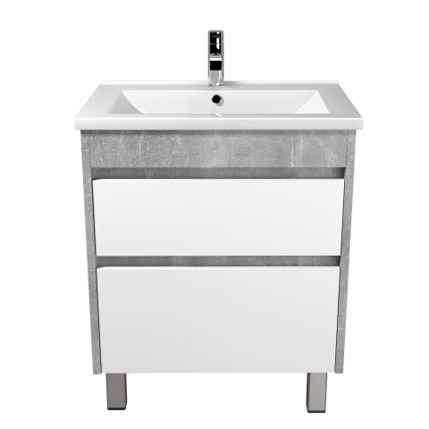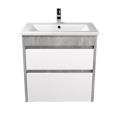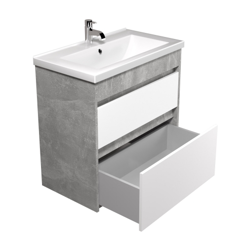 Идеальная тумба для ванной с умывальником 70-U Polo Loft Мойдодыр для ценителей таких стилей как скандинавский, лофт и хай-тек прекрасно дополнит интерьер ванной комнаты и поможет рационально использовать пространство под раковиной и улучшает эстетичный вид в целом. Тумба комплектуется умывальником из искусственного камня «Cosmopolitan-70», производитель «TM Amidicon», Украина и имеет два выдвижных ящика, что позволит удобно разложить всевозможные гели, кремы, полотенца и прочие принадлежности, спрятать бытовую химию, которая не должна быть на виду. Корпус изготавливается из влагостойкого ламинированного ДСП Kronospan (Польша) толщиной 18 мм с фасадами из ДСП Kronospan (Польша) толщиной 16 мм покрытыми влагостойкой краской ультрафиолетового твердения Iris (Испания), что обеспечивает устойчивость к воздействию влаги и долговечность, в современном цветовом сочетании бетон / белый глянцевый. Главной особенностью серии Polo Loft Мойдодыр является актуальный дизайн в простой форме; необычные и функциональные эстетические решения и максимальное удобство использования; отсутствие ручек, их роль выполняют фрезерованные на фасаде выемки; универсальное использование - возможен как напольный, так и подвесной монтаж; фирменные комплектующие: направляющие Hettich с плавным закрыванием, обеспечивающие плавное и мягкое закрывание. Поло Лофт Мойдодыр отлично впишется в интерьер, делая вашу ванную комнату элегантной и функциональной.