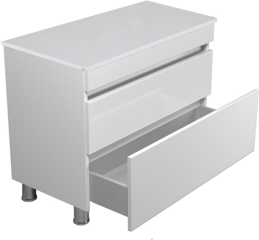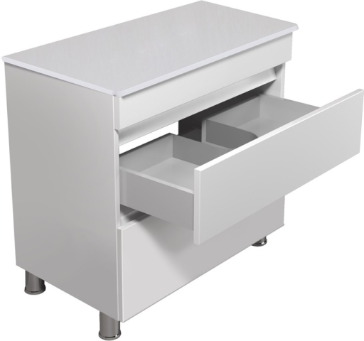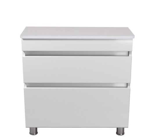 Тумба для ванной со столешницей 80-U ST MoonShine Мойдодыр прекрасно дополнит интерьер ванной комнаты и поможет рационально использовать пространство под раковиной и улучшает эстетичный вид в целом. Тумба имеет два выдвижных ящика, которые позволят удобно разложить всевозможные гели, кремы, полотенца и прочие принадлежности, спрятать бытовую химию, которая не должна быть на виду. Главной особенностью серии являются приятный дизайн; отсутствие ручек, их роль выполняют фрезерованные на фасаде выемки; напольный монтаж с хромированными ножками; фирменные комплектующие: направляющие Hettich, которые обеспечивают плавное и мягкое закрывание. Благодаря мебели MoonShine Мойдодыр Вы можете спроектировать ванную комнату без всяких усилий!