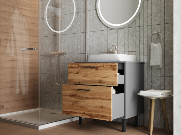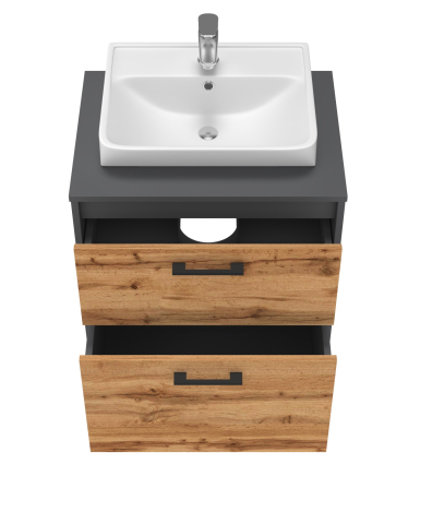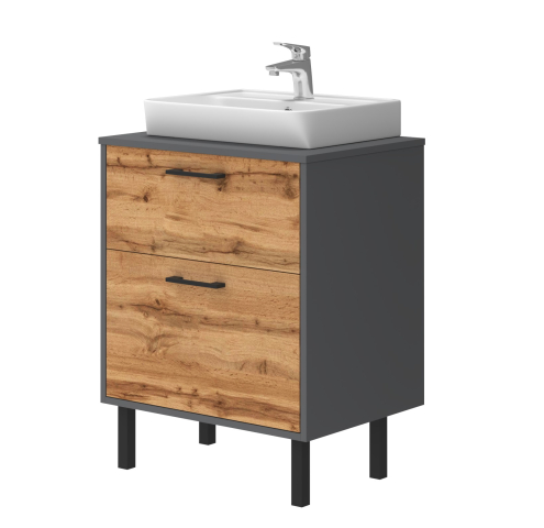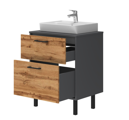 Тумба для ванной со столешницей МДФ и умывальником Neon-45 60 Afina антрацит / дуб вотан Ювента в элегантном и современном дизайне, сочетающая природные и индустриальные мотивы, превращая вашу ванную комнату в настоящее произведение искусств, где каждый элемент продуман до мелочей, чтобы дарить вам удовольствие каждый день. Тумба комплектуется керамическим умывальником «Neon-45», производитель «Sanovit», Турция и в своей конструкции имеет два ящика, которые изготовлены из ламинированного ДСП толщиной 16 мм и установлены на направляющие с функцией самодотягивания частичного выдвижения, Hafele. При этом верхний ящик имеет высоту 240 мм, а нижний ящик выше, 334 мм, что позволит вам хранить внутри него различную бытовую химию в высоких бутылках. Также в конструкции тумбы предусмотрен общепринятый и гармонизированный со всеми европейскими стандартами подвод и отвод воды. С комплектом мебели для ванной Afina антрацит / дуб вотан Ювента ваша ванная комната станет местом, где практичность встречается с элегантностью, а каждый день наполнен комфортом и стилем. Позвольте себе роскошь и функциональность, которые вдохновляют.