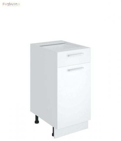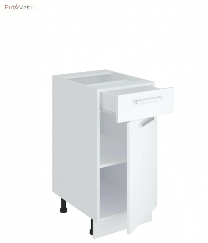 Функциональная и вместительная нижняя тумба Н40 Алина Сокме прекрасно подойдет для хранения кухонной утвари различного размера, сковород, кухонной техники и других крупногабаритных и тяжелых предметов. Данная конструкция оснащена одним закрытым отделением с полочкой внутри, и небольшими выдвижным ящиком, для хранения столового инвентаря. Для удобства двери могут навешиваться как с правой стороны, так и с левой. Столешница комплектуется и продается отдельно. Корпус и фасады изготавливаются из качественного ДСП толщиной 16 мм в идеально чистом «белом» цвете, позволяющем создавать всевозможные шедевры с неким шармом и очарованием, располагая к себе человека и создает комфортную атмосферу. Торцевые поверхности всех внутренних и наружных элементов изделий облицованы кромкой ABS толщиной 0,5/1 мм, придавая мебели завершенный красивый и ухоженный вид. Коллекция привлекает внимание современным дизайном; цветом чистоты и благородства, который сделает кухню необыкновенно притягательной и изящной; продолговатыми пластиковыми ручками, серебристого цвета; прочными ножками, способствующие максимальной устойчивости с цокольными планками, которые комплектуются силиконовым профилем, предотвращая попадание влаги и грязи; фирменными комплектующими: роликовыми направляющими GTV и петлями без доводчика Hafele, которые обеспечивают максимальный комфорт в использовании. Белоснежная кухня Алина Сокме - зрительно расширит пространство и подарит ощущение свободы, заряд положительной энергии и хорошего настроения.