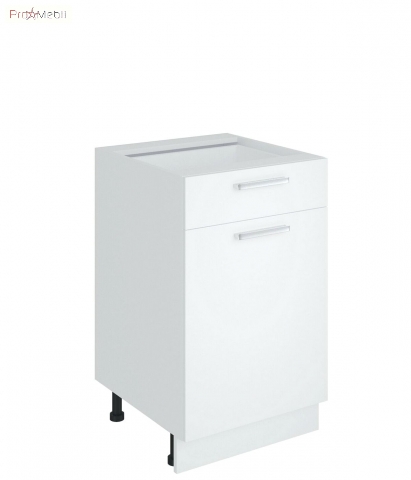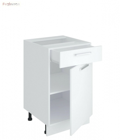 Функциональная и вместительная нижняя тумба Н50 Алина Сокме прекрасно подойдет для хранения кухонной утвари различного размера, сковород, кухонной техники и других крупногабаритных и тяжелых предметов. Данная конструкция оснащена одним закрытым отделением с полочкой внутри, и небольшими выдвижным ящиком, для хранения столового инвентаря. Для удобства двери могут навешиваться как с правой стороны, так и с левой. Столешница комплектуется и продается отдельно. Корпус и фасады изготавливаются из качественного ДСП толщиной 16 мм в идеально чистом «белом» цвете, позволяющем создавать всевозможные шедевры с неким шармом и очарованием, располагая к себе человека и создает комфортную атмосферу. Торцевые поверхности всех внутренних и наружных элементов изделий облицованы кромкой ABS толщиной 0,5/1 мм, придавая мебели завершенный красивый и ухоженный вид. Коллекция привлекает внимание современным дизайном; цветом чистоты и благородства, который сделает кухню необыкновенно притягательной и изящной; продолговатыми пластиковыми ручками, серебристого цвета; прочными ножками, способствующие максимальной устойчивости с цокольными планками, которые комплектуются силиконовым профилем, предотвращая попадание влаги и грязи; фирменными комплектующими: роликовыми направляющими GTV и петлями без доводчика Hafele, которые обеспечивают максимальный комфорт в использовании. Белоснежная кухня Алина Сокме - зрительно расширит пространство и подарит ощущение свободы, заряд положительной энергии и хорошего настроения.