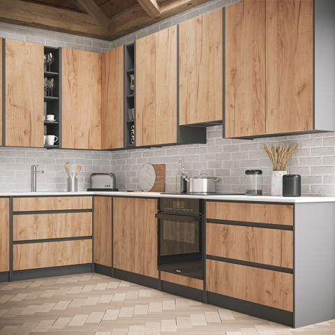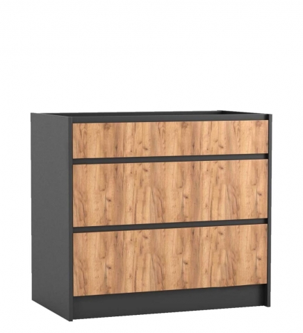 Нижняя тумба Н90Ш кухня Граффити Світ Меблів является прекрасным дизайнерским решением в стиле лофт с энергетикой брутальной практичности, красотой натуральных материалов и при этом 100 процентов функциональностью в интерьере. Тумба нижняя содержит три выдвижных ящика с телескопическими направляющими полного выдвижения и прекрасно подойдет для хранения различной кухонной утвари – различных столовых приборов, посуды или ингредиентов. Столешница комплектуется и продается отдельно. Корпус и фасады изготавливаются из качественного ламинированного ДСП с использованием натуральных цветов и фактур в сочетании графитового корпуса и фасадов в цвете дуб крафт золотой. Кухня Граффити Світ Меблів поможет получить оригинальный интерьер кухни, на первый взгляд, грубоватый, но в то же время уютный и практичный. Кухня в стиле лофт отлично подойдет тем, кто устал от шаблонных интерьеров.