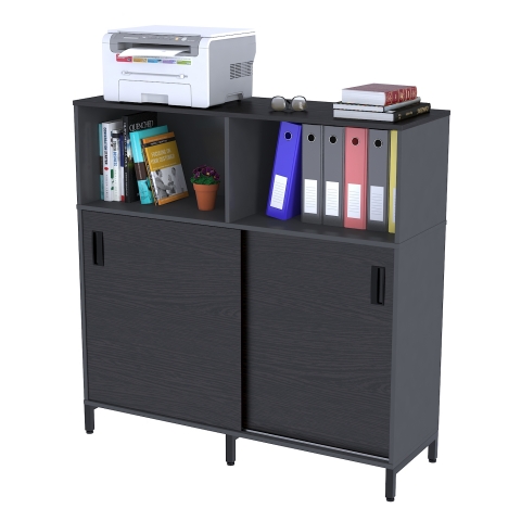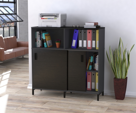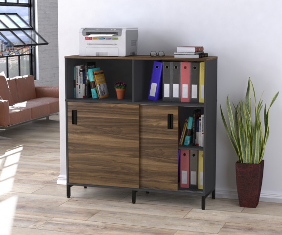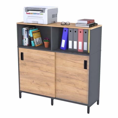 Офисная раздвижная тумба LS-1200-1200 от компании Loft Design - это увеличенная модификация полюбившейся тумбы LS-1200-830. Дополнительный открытый отсек увеличивает полезное пространство. В него можно положить предметы, которыми вы часто пользуетесь или предметы, которые должны быть всегда на виду, например, книги и журналы. Эта тумба смотрится ещё более солидно, благодаря большему размеру. Помимо увеличения вместительности, тумба с открытыми элементами смотрится менее громоздкой. Одна такая тумба вместит всю необходимую бухгалтерию небольшого офиса. Это современный многофункциональный и в то же время стильный предмет интерьера. В угоду современным тенденциям, тумба выполнена в минималистическом стиле. У неё отсутствуют декоративные элементы, а врезные ручки и раздвижные двери не выступают за пределы тумбы. Однако благодаря красивому сочетанию фасадов, имеющих расцветку с выраженной древесной текстурой, корпуса выполненного в цвете Антрацит, а также чёрных матовых металлических ножек, достигается модный сейчас стиль Лофт. Тумба отлично подойдёт для офисного помещения. В неё можно поместить документы в папках, сегрегаторы, бумагу для принтера и прочее. А сверху тумбы можно разместить принтер, чайник или цветы. Глубина полок составляет 320 мм. Высота - 335 мм. Двери тумбы оснащены раздвижным механизмом: внизу устанавливаются колёса, а сверху направляющие, которые ходят по алюминиевым рейкам. Двери фиксируются в закрытом положении с помощью стопоров.