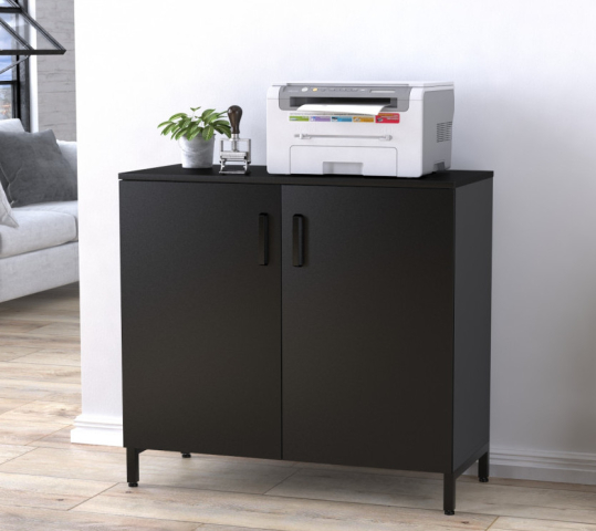 Тумба офисная LT-900-830 антрацит Loft Design - это классическая невысокая офисная тумба с двумя дверями и полками внутри. Однако она имеет некоторые отличительные особенности, которые выделяют её среди аналогов. Это металлические опоры, которые придают внешне лёгкость и необычность, а также двухцветная расцветка, которая делает акцент на красивых фасадах и в тоже время отводит взгляд от громоздкого каркаса. Каркас тумбы выполнен из ламинированного ДСП в цвете Антрацит. Двери и верхняя крышка изготавливается в расцветках: венге луизиана, дуб крафт золотой, дуб палена, орех модена, черный. Металлические опоры и ручки черного цвета. Опоры комплектуются регулируемыми ножками, которые позволяют выставить тумбу на неровном полу. Глубина полок составляет 396 мм. Высота - 335 мм. Тумба отлично подойдёт для офисного помещения. В неё можно поместить документы в папках, сегрегаторы, бумагу для принтера и прочее. А сверху тумбы можно разместить принтер, чайник или цветы.