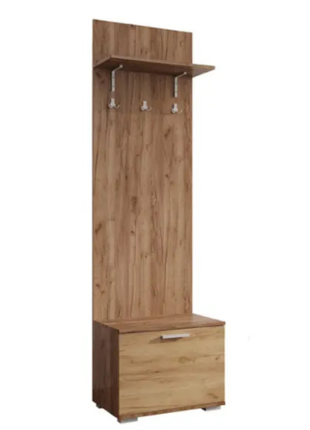 Функціональна цілісна конструкція тумба з вішаком Віва Сокме ідеальний варіант для невеликого передпокою. Комплект складається з відкритого вішака і тумби для взуття. Вішак чудово підійде для розміщення верхнього одягу і обладнаний трьома гачками для верхнього одягу і полицею для головних уборів. Тумба полегшить порядок в передпокої і дозволить вам зручно зберігати взуття. Тумба містить закрите відділення за відкидною дверцею. Корпус і фасади виготовляються з якісного ДСП товщиною 16 мм в актуальних відтінках дуб крафт табако / дуб крафт золотий, таке контрастне поєднання виглядає живо і природно, наповнюючи простір теплом, світлом і виразною текстурою натуральної деревини. Торцеві поверхні всіх внутрішніх і зовнішніх елементів виробів облицьовані крайкою ABS товщиною 0,5 мм, надаючи меблям завершений гарний і доглянутий вигляд. Колекція привертає увагу стриманим дизайном; простотою форм; зручними і місткими елементами; довгастими пластиковими ручками, сріблястого кольору; пластиковими ніжками; фірмовими комплектуючими: телескопічними напрямними і завісами без дотягу, які забезпечують максимальний комфорт у використанні. Меблі Віва Сокме відмінно підійдуть шанувальникам мінімалізму, дозволивши Вам проявити свою фантазію і створити затишне оточення в будинку.