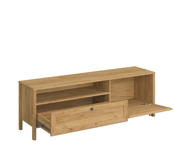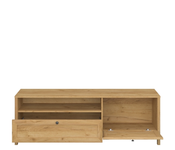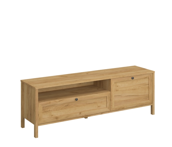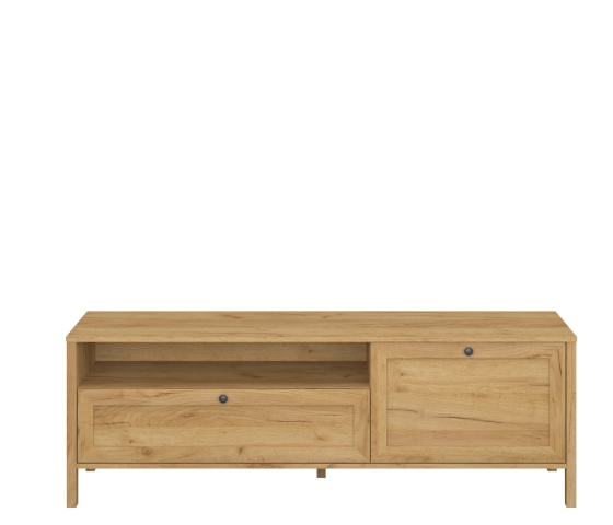 ТВ тумба 1K1S Кларк Кларк - сочетание стиля модерн с нотками кантри, от украинской мебельной фабрики VMV Holding для обустройства гостиной. Тумба содержит один выдвижной ящик, одно открытое и одно закрытое отделение с открывающимся вниз фасадом. Корпус изготавливается из высококачественного ламинированного ДСП Kronospan толщиной 16 мм, фасадные части из ламинированного ДСП Kronospan толщиной 16 мм с элементами МДФ в приятном древесном оттенке дуб крафт золотой. Уникальности тумбе придают безупречная эстетика; естественная теплота древесного оттенка; небольшие темные ручки круглой формы; рамочные фасады; выразительные массивные боковые планки, плавно переходящие в высокие ножки; фирменные комплектующие. Благодаря мебели Klark VMV Вы создадите в интерьере уютную атмосферу и по-домашнему семейное тепло.
