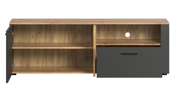 тумба содержит один выдвижной ящик, закрытое отделение с полочкой внутри и открытую нишу с отверстием для проводов |
