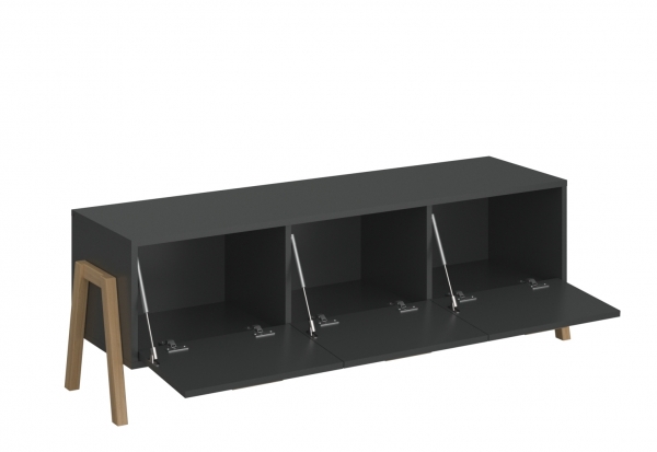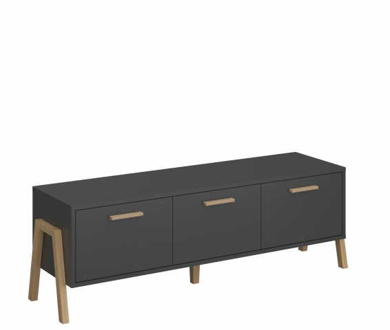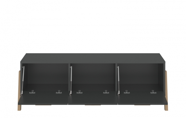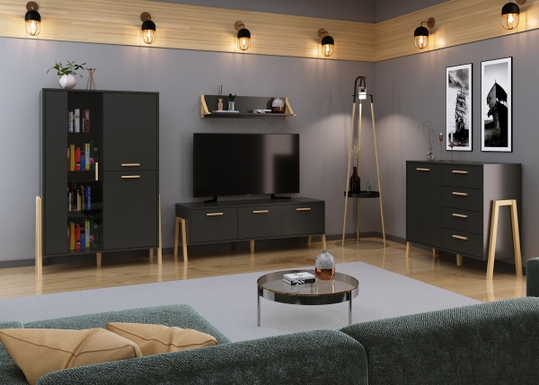 ТВ тумба 3K Бель антрацит ВМВ представляет собой удивительное сочетание изысканного вкуса, стиля и элегантности, которая обязательно покорит даже самых взыскательных клиентов и легко создаст модное и функциональное пространство в гостиной. Тумба содержит три закрытых отделения с откидными дверцами. Мебель привлекает внимание своим неординарным дизайном и интересной формой; необычной ассиметричной композицией; классическим антрацитовым оттенком; удлиненными удобными ручками и высокими выступающими по бокам ножками, изготовленными из натурального дерева; фирменными комплектующими. Коллекция Belle VMV порадует всех любителей инновационных идей, а также современных, оригинальных и элегантных интерьеров, тех, кто ценит роскошь и комфорт в своем доме.