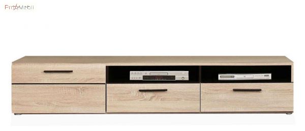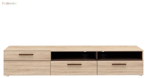 Тумба под телевизор правая 1D2S P из коллекции модульной мебели Соло украинской фабрики VMV. Оригинальная асимметричная тумба под телевизор с одной дверкой, за которой полочка и двумя выдвижными ящичками. Главной особенностью являются теплый цвет, простые геометрический формы, закругленные края и декоративные вставки в цвете венге, разделяющие фасад на отдельные блоки, а также отверстия для проводов. Фасад дверок украшают длинные прямоугольные ручки.