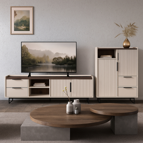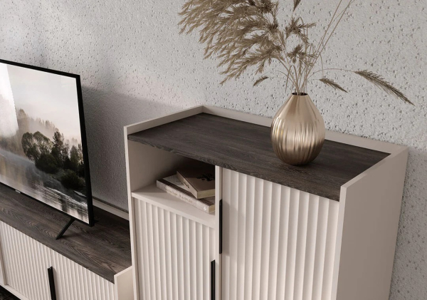 Восхитительная ТВ тумба RTV2D2S Фреско ВМК (БРВ), наполненная благородной эстетикой и современным шармом, созданная для стильного и продуманного обустройства гостиной. ТВ тумба содержит два выдвижных ящика, два закрытых отделения с полками внутри и открытые ниши для размещения мультимедийной техники или декоративных элементов. Коллекция привлекает рельефными и фактурными вертикальными планками, создающими эффект архитектурной глубины и игру света и тени на фасадах, подчеркивая ритм и структуру поверхности; эффектным сочетанием утонченного оттенка «кашемир» с выразительными столешницами «каштан арвадонна минк», придавая коллекции ощущение уюта, респектабельности и природной теплоты; металлическими ручками, черного цвета, элегантно интегрированными в фасады, добавляющие графичности, контраста и динамики всей композиции; высокими, металлическими ножками, черного цвета, придающими конструкции легкость и воздушность, подчеркивая современный характер мебели; качественной фурнитурой, которая обеспечивает мягкость, плавность и бесшумность в использовании, создавая дополнительный комфорт в повседневной эксплуатации. Фреско кашемир / каштан арвадонна минк — архитектура уюта, наполненная чувством стиля, природной гармонии и утонченного вкуса.