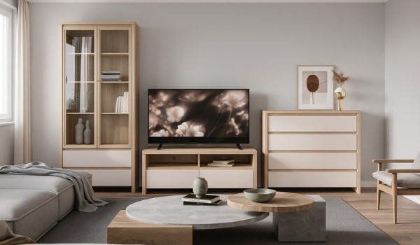 ТВ тумба RTV2S/120/40 Каспиан кашемир ВМК (БРВ) для тех, кто мечтает наполнить свой дом теплом натуральных фактур в тандеме с актуальными дизайнерскими решениями от фабрики БРВ Украина, позволяющий создавать цельные и выразительные мебельные композиции для гостиной. Функциональная и практичная тумба содержит два выдвижных ящика и два открытых отделения с техническими отверстиями для проводов в задней стенке. Коллекция покоряет с первого взгляда – своим теплым, душевным дизайном; изысканными материалами в природной, мягко-золотистой палитре с утонченным кашемировым акцентом; светлыми, обволакивающими полутонами бежево-серых и песочных оттенков; продуманными формами и уютной, ясной геометрией; оригинальным решением – отсутствием привычных ручек: вместо них используется деликатная фрезеровка по верхнему краю фасадов; надежными комплектующими. Каспиан дуб сонома / кашемир ВМК (БРВ) – достойное решение для создания уютной и стильной обстановки в доме.