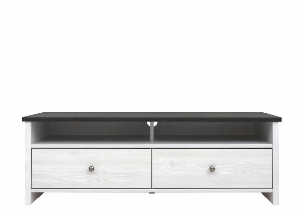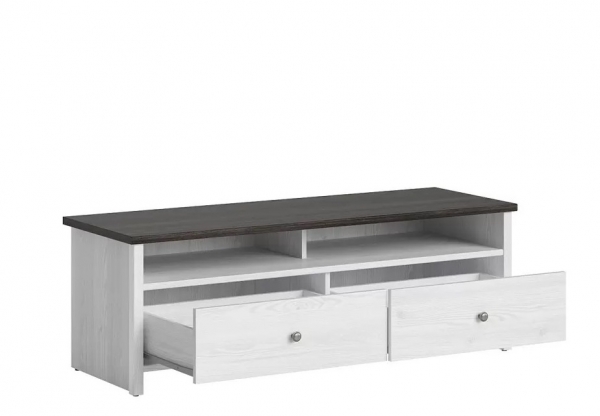 тумба содержит два выдвижных ящика и два открытых отделения с отверстием в задней стенке для проводов |