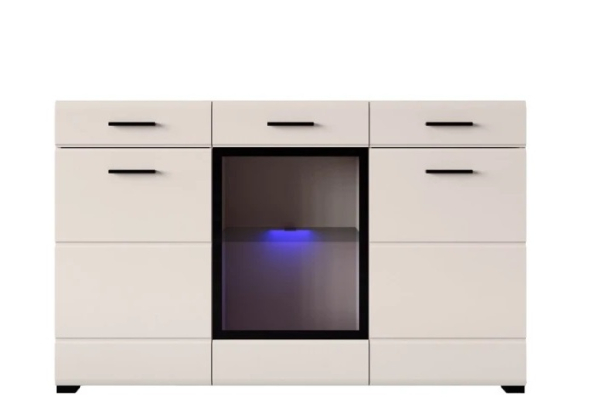 Буфет-вітрина KOM1W2D2S Арктика ВМК (БРВ) - стильне рішення в дусі сучасного мінімалізму від українського бренду ВМК-Україна, що поєднує функціональність і витонченість та створює атмосферу легкості і гармонії в інтер'єрі. Буфет поєднує в собі три закритих відділення і дві висувні шухляди, забезпечуючи зручне зберігання і порядок в будинку. Естетика моделі будується на елегантності відтінку кашемір, який підкреслює лаконічність форм і створює м'яку, витончену атмосферу в інтер'єрі. Корпус виконаний з міцного ламінованого ДСП, фасади – з якісного МДФ, а вітринні вставки прикрашені прозорим тонованим склом. Витончені довгасті ручки чорного кольору створюють стильний акцент і підкреслюють геометрію фасадів. Арктика ВМК (БРВ) – меблі, які перетворюють навіть найпростіший інтер'єр на сучасний, вишуканий і теплий простір.