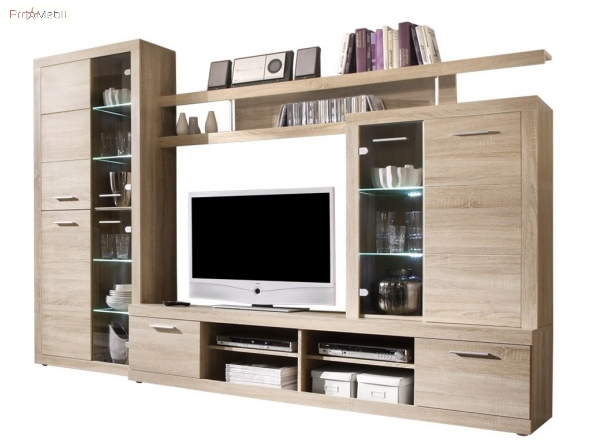Гарнітур у вітальню Елія ВМК – Україна (БРВ) – практичний та функціональний меблевий комплект у стилі модерн від фабрики ВМК – Україна, для облаштування модної та сучасної вітальні. Виготовляється з ламінованої ДСП у стильному відтінку дуб сонома. Меблі Елія ВМК – Україна (БРВ) приваблюють строгими лініями; мінімалізмом у дизайні; оригінальним поєднанням текстур; довгастими ручками сріблястого кольору; світлодіодним підсвічуванням скляних полиць; фірмовими комплектуючими: роликовими напрямними часткового висунення.