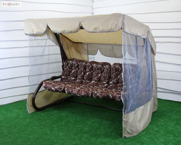 Гойдалка садова Барна 029 GreenGard з москітною сіткою - варіант преміум класу для відпочинку в саду української фабрики GreenGard. Тримісні гойдалки за типом ліжко, що коливається, в коричневому кольорі з принтом вензеля подарують незабутні хвилини відпочинку в компанії рідних і друзів. Головною особливістю моделі є наявність захисного тенту, підлокітників, москітної сітки та можливість регулювати нахил спинки до лежачого положення. Також додатково можна укомплектувати полицями для різних дрібниць. Більшого комфорту забезпечує м'який матрац. Міцний матеріал каркасу та якісний водовідштовхувальний текстиль забезпечують надійність та довговічність у використанні, а також простоту у догляді.