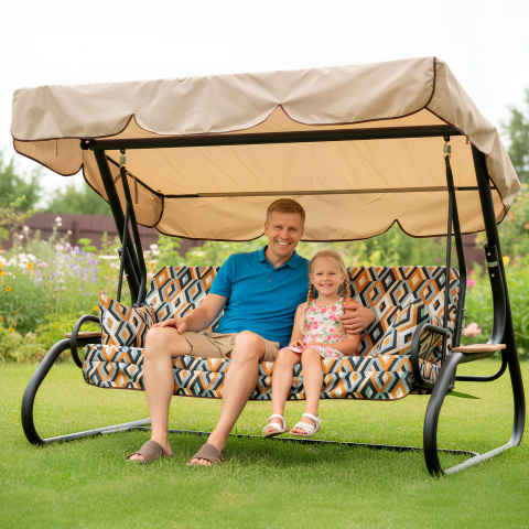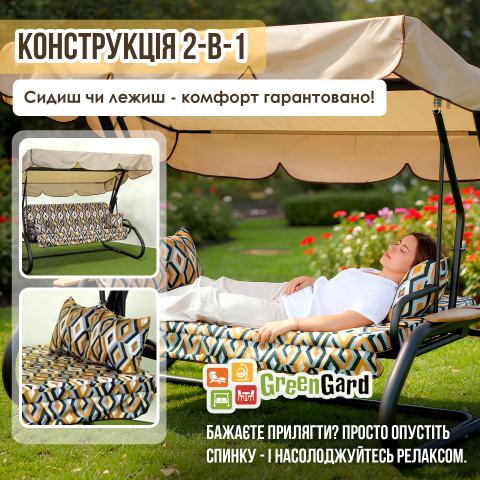 Гойдалка садова Латте 036-2 GreenGard виглядає так, ніби створена для тих моментів, коли хочеться сповільнитися і просто насолодитися літом. У моделі дуже вдале поєднання: сучасна форма, спокійна тепла палітра і справжній побутовий комфорт, який відчувається не тільки за зовнішнім виглядом, але і в кожній деталі. Чорний матовий каркас надає конструкції виразності, бежевий тент робить образ м'якшим, а подушки з геометричним візерунком додають характеру і візуальної глибини. Простору тут дійсно багато. Гойдалка розрахована на чотирьох осіб, тому на ній зручно відпочивати всією сім'єю або проводити час в компанії близьких. Розміри 2200 × 1600 × 2000 мм роблять конструкцію місткою і солідною, а сидіння 1800 × 555 мм легко трансформується в широке місце для відпочинку розміром 1800 × 1150 мм. Така конструкція 2-в-1 особливо хороша тим, що підлаштовується під настрій: вранці це затишне місце для кави і розмов, вдень — прохолодний куточок в тіні, а ввечері — комфортний простір, де можна прилягти і розслабитися. Основа моделі виконана зі сталевої труби діаметром 60 мм. Каркас доповнений полімерним покриттям, яке не тільки підкреслює акуратний зовнішній вигляд, але і робить конструкцію практичною для використання на вулиці. Максимальне навантаження до 400 кг говорить про хороший запас міцності, тому гойдалки підходять для щоденного відпочинку і впевнено справляються з активною експлуатацією. Особливу атмосферу створює м'яка частина. Подушки з меблевого велюру приємні на дотик і виглядають виразно завдяки візерунку «Ромб». Наповнювач з поролону товщиною 80 мм дає відчутну м'якість, підтримує комфортну посадку і допомагає по-справжньому розслабитися. У комплекті передбачені дві подушки, які роблять відпочинок ще приємнішим і додають відчуття домашнього затишку навіть на відкритому повітрі. Тент з тканини Oxford в бежевому відтінку завершує образ моделі і робить її ще зручнішою у використанні. Водовідштовхувальний матеріал допомагає сховатися від яскравого сонця і легкого дощу, а можливість регулювати нахил тенту дозволяє легко змінювати положення тіні протягом дня. Латте 036-2 GreenGard - місце, де кожен теплий день звучить спокійніше, м'якше і красивіше.