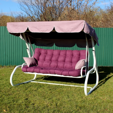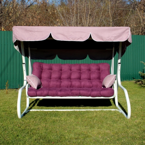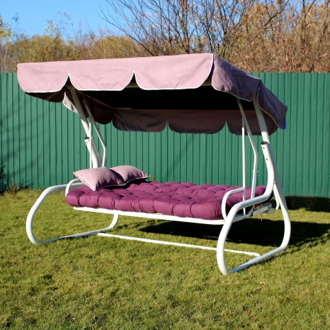 Гойдалка садова Магнолія 088 GreenGard - чудова модель для відпочинку в саду української фабрики GreenGard. Чотиримісна гойдалка по типу ліжка з коливальним механізмом у фіолетовому кольорі подарують незабутні хвилини відпочинку в компанії рідних та друзів. Головною особливістю моделі є наявність захисного тенту, підлокітників і можливість регулювати нахил спинки до лежачого положення. Так само додатково можна укомплектувати полицями для різних дрібниць. Більшого комфорту забезпечує м'який матрац. Міцний матеріал каркаса і якісний водовідштовхувальний текстиль забезпечують надійність і довговічність у використанні, а так само простоту в догляді.