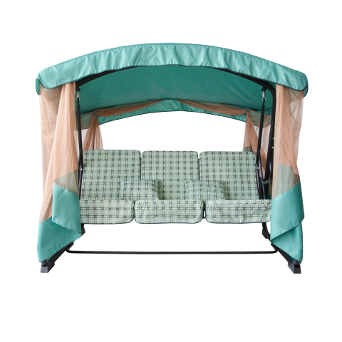 Гойдалка садова Сімейна двостороння велика зелено-сіра клітинка / коричнева Vitan - варіант люкс класу для відпочинку в саду української фабрики Vitan. Каркас даної моделі виконаний із сталевих труб декількох діаметрів, основним з яких є труба діаметром 51 мм. Основа сидіння пружинний блок, оригінальність полягає в тому, що виконаний цей блок методом плетіння металевого дроту, що забезпечує надійність і зручність при сидінні. Весь сталевий каркас покритий полімерним покриттям, для стійкості від корозії, а також для стильності зовнішнього вигляду. Дана конструкція - гойдалки Сімейна повністю розбирається на окремі деталі, що дуже зручно для зберігання і транспортування. Для збірки є детальна інструкція, де схематично пояснюється, як зібрати, або розібрати гойдалку. Тент даху зі спеціальної вологостійкої матерії, під назвою Поліестер, сидіння виготовлено з пружинного блоку і сталевого дроту. На сидінні м'який матрац з поролону 60 мм і синтепону 15 мм, тканина бязь Голд - 100% бавовна. На гойдалці можуть розміститися 4 дорослих особи, а якщо з маленькими дітками то і все 6! Максимально допустиме навантаження до 300 кг. Широке сидіння дозволить зручно розташуватися на гойдалці і насолодитися відпочинком в ній. Габаритні розміри даної моделі Сімейна: висота - 167 см, ширина - 215 см, глибина - 147 см.